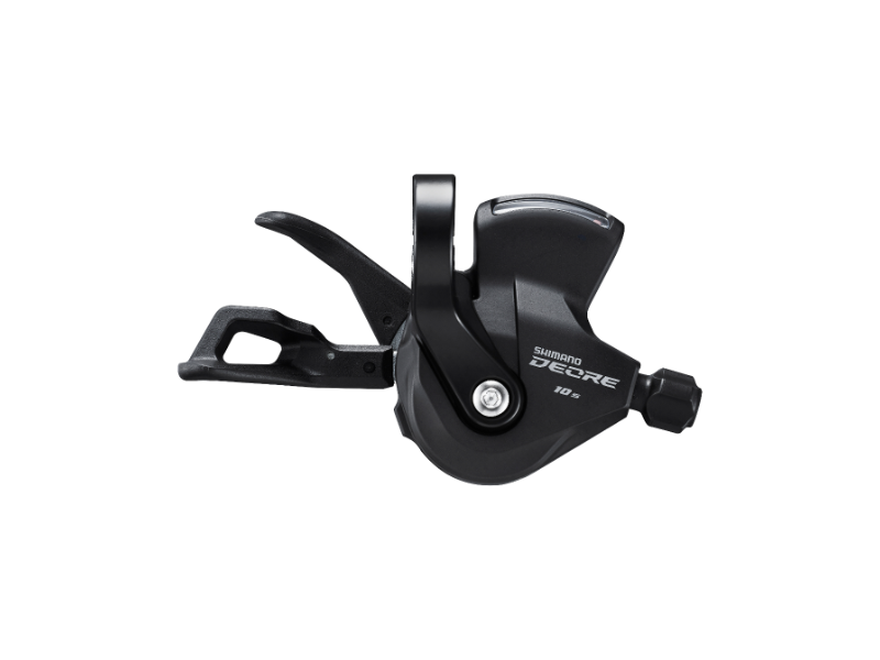 The Shimano Deore SL-M4100-R right derailleur shifter features the Rapidfire Plus system for 3-speed shifting in one go, while the 2-Way Release technology allows the rider to quickly change gears when approaching a hill. The lever is attached to the handlebar with a clamp.